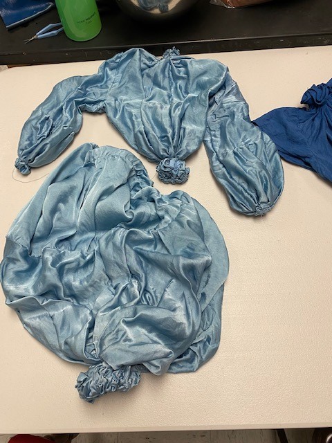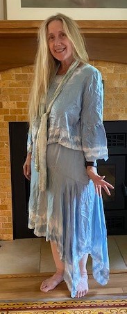 Using silk and we hand stitched this super cool Shibori design around the neck, sleeves and the bottom of the blouse. I did the same Shibori ‘scoop’ effect design on the asymmetrical skirt. After two dips, the fabric reached a beautiful pale blue, when dry it’s a silvery blue. So beautiful!
